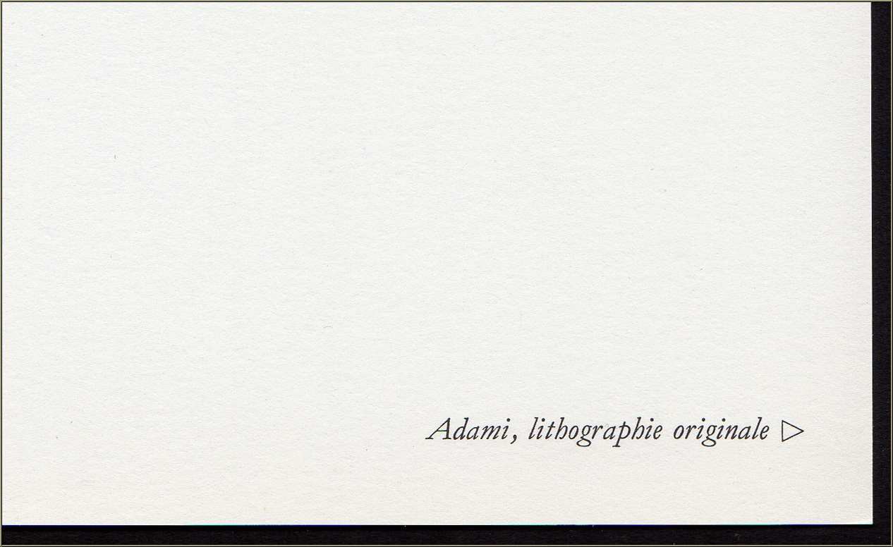 | | | « Philosophe » (Stèle) Hommage à Aimé et Marguerite Maeght | Lithographie originale en couleurs de Valerio Adami | | Dimensions : | 38 x 28 cm (feuille) | | Tirage : | Ici, une des épreuves de l'édition limitée sur papier vélin, non signée. La lithographie a été tirée séparément sur vélin d'Arches à 100 exemplaires, numérotées et signées par l'artiste. | | Remarques : | Ceci n'est pas une reproduction récente ou un retirage (quadrichromie ou grano lithographie d'une « édition limitée ») mais la lithographie originale de 1982. Impimée au verso, comme editée | | Éditeur : | Galerie Maeght, Paris, 1982 | | Références : | Maeght Éditeur. Derriere le miroir 1946-1982. Maeght, Paris, 1983, page 110 | | État : | Details En parfait état de conservation. Cadre non fourni. | | Évaluations des clients : Il n'y a pas encore d'evaluations. Seulement les client qui ont acheté cet article et qui sont connecté peuvent l'evaluer. Votre nom est automatiquement affiché de manière anonyme, par ex. « Olivier M., France ».  *Valent pour les livraisons vers l'Allemagne payées via PayPal. En cas de paiement par virement bancaire, la livraison prendra un à trois jours de plus à partir du jour du virement en question. Pour connaître les délais de livraison pour d’autres pays et estimer le jour de livraison, rendez-vous ici |