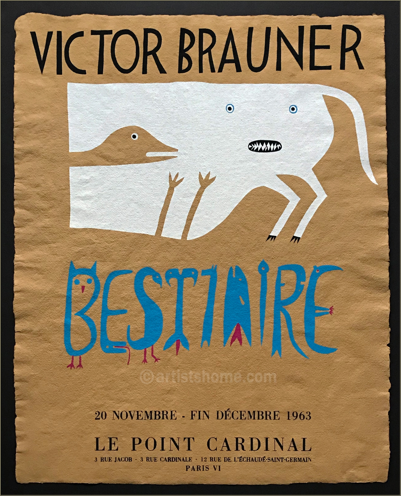 Détails :« Victor Brauner - Bestiaire » 1963 Affiche d'exposition imprimée en sérigraphie sur papier Auvergne teinté.